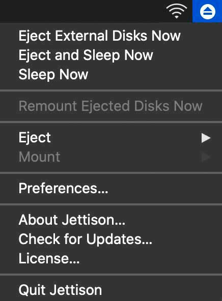 Genau hier setzt Jettison an: Die App läuft im Hintergrund und kümmert sich automatisch um das Auswerfen der Wechselmedien vorm Ruhezustand und mountet sie wieder beim Aufwachen. Außerdem hat man für das Auswerfen und Mounten von Festplatten schnellen Zugriff über die Menüleiste und muss nicht immer erst zum Finder oder gar Festplattendienstprogramm wechseln.