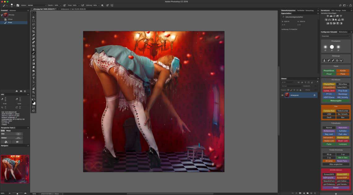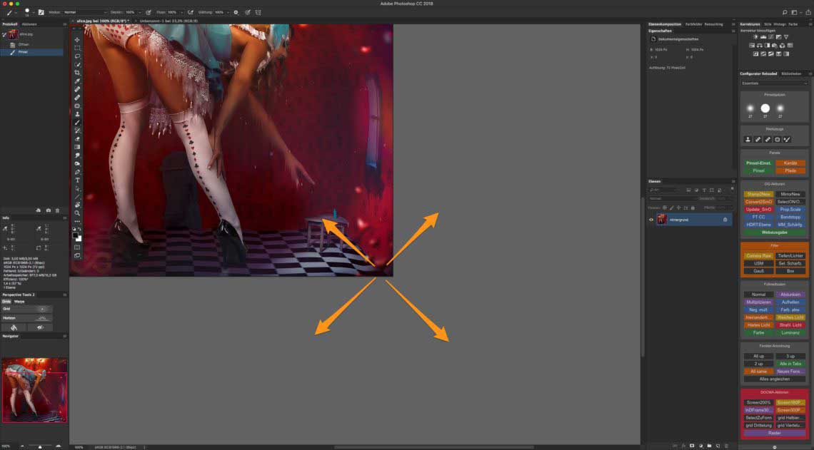 Am liebsten arbeite ich mit »Ansicht > Bildschirmmodus > Standardmodus« weil man dort über der Arbeitsfläche die Tabs aller geöffneten Dateien sieht und unten verschiedene Bildinformationen sieht beziehungsweise einblenden kann (Zoomstufe, Farbprofil, Ebenenanzahl und vieles mehr). Außerdem hat dieser Modus den Vorteil, dass man über »Strg/Cmd-0« ein geöffnetes Bild in die Fenstergröße einpassen kann, ohne dass Teile des Bildes – wie im Vollbildmodus mit Menüleiste – hinter den angedockten Paletten verschwinden. Unterbrechungsfrei arbeiten kann ich in diesem Modus aber nur bei aktivierter Option »Überscrollen«.