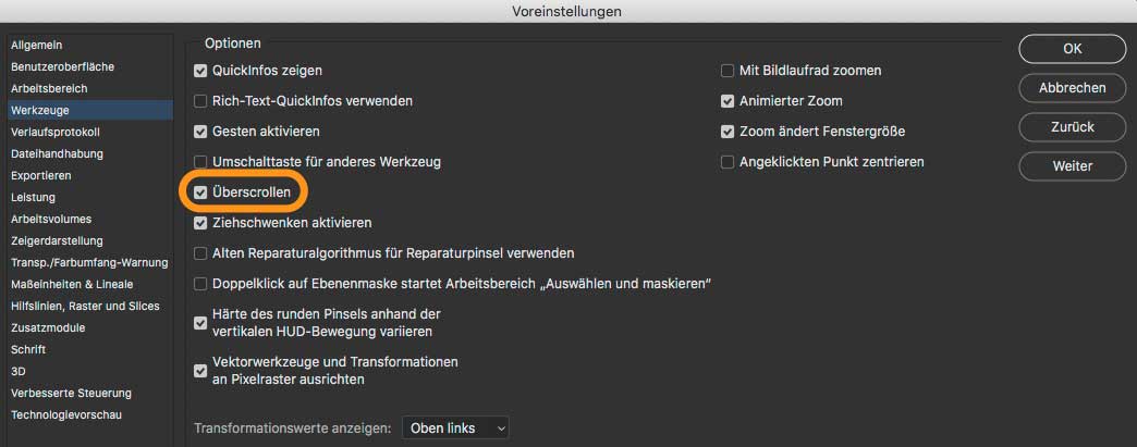 Zum Glück ist das in Photoshop CC inzwischen kein Problem mehr, jedenfalls WENN Sie eine etwas versteckte Option kennen. Deshalb mein Tipp: Aktivieren Sie in den Voreinstellungen unter »Werkzeuge > Optionen« die Checkbox »Überscrollen«. Problem gelöst. Nun können Sie auch im »Standardmodus« das Bild frei verschieben, und zwar unabhängig von der Zoomstufe.