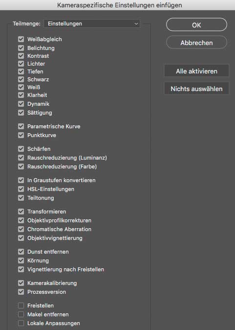 Um Camera Raw-Einstellungen von einem Bild auf andere zu übertragen, kopieren Sie mit »Rechtsklick > Entwicklungseinstellungen > Einstellungen kopieren« die Raw-Settings in die Zwischenablage und wenden sie auf danach ausgewählte Fotos über »Einstellungen einfügen« im gleichen Menü an. Im sich öffnenden Dialog wählen Sie, welche Entwicklungsparameter eingefügt werden.