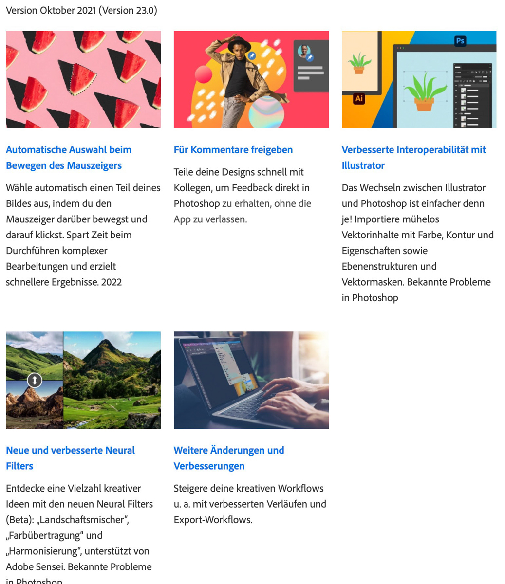 Ich meine: Auf den ersten Blick scheinen die Neuerungen wenig aufregend zu sein. Bugfixes und technische Verbesserungen sind natürlich immer willkommen, aber im Prinzip gibt es offenbar nur ein verbessertes Objektauswahl-Werkzeug sowie drei neue Neural Filters, die alle noch im Beta-Stadium sind.