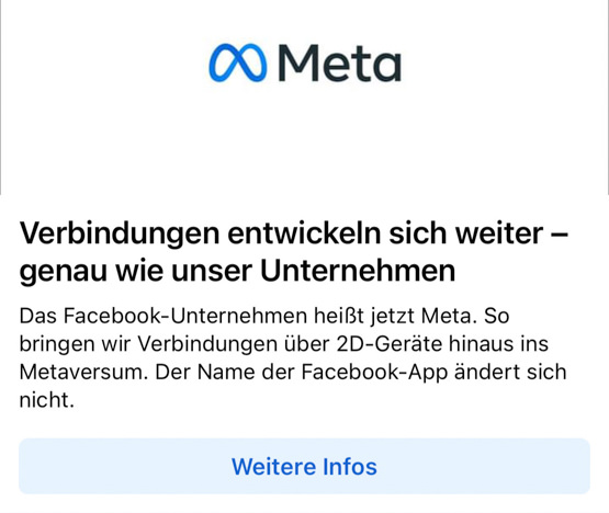 Kollege Michael hatte das Thema vor zwei Wochen schon in seinem Blogbeitrag aufgegriffen: Aus dem Unternehmen Facebook wird Meta. Jetzt wurde auch das Logo vorgestellt: