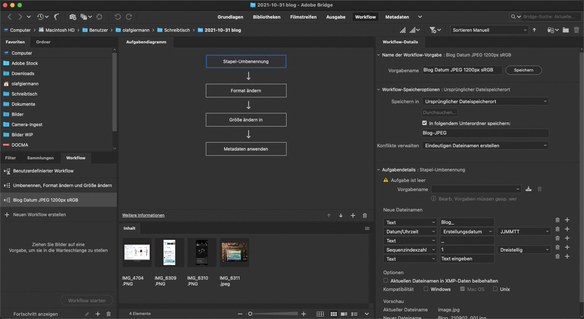 Zum anderen: Sehr praktisch ist auch die neue Möglichkeit „Workflows“ anzulegen. Diese können in einem einzigen Arbeitsschritt ganze Stapel von Bildern umbenennen, deren Format und Größe ändern und die Metadaten anpassen. Per Drag-and-drop auf die erzeugte Vorgabe starten Sie die Konvertierung. Ein echter Zeitsparer! Das Export-Panel dürfte damit eigentlich überflüssig geworden sein, ist aber nach wie vor vorhanden.