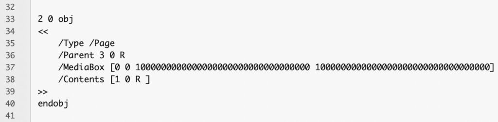 Genau genommen gibt es in der PDF-Spezifikation keine absolute Grenze; nur Adobe Acrobat ist auf die erwähnten 381 Kilometer in der Breite und Höhe beschränkt. Aber stimmt das überhaupt? Die britische Softwareentwicklerin Alex Chan wollte es genau wissen („Making a PDF that’s larger than Germany“), rechnete nach und probierte ein paar Tricks aus. PDF ist ja eigentlich eine Programmiersprache und man kann Code in dieser Sprache auch per Hand schreiben, wodurch man einige Optionen gewinnt, die es in Acrobat nicht gibt. Auf diese Weise fand sie heraus, dass der größte von Acrobat akzeptierte Zahlenwert für die Breite und Höhe 14.400 ist, und welcher Länge das entspricht, hängt von der verwendeten Einheit ab – normalerweise 1/72 Zoll, was eine Kantenlänge von 5,1 Meter ergibt. Man kann die Einheit aber bis auf das 75.000-fache vergrößern, womit man auf die üblicherweise kolportierten 381 Kilometer kommt.
