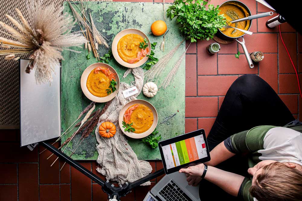 Die Kürbissuppe möchte Heike etwas ausgefallener inszenieren und nutzt den ColorReader EZ für ihre Farbinspiration am Set. Dafür misst sie zunächst die Farbe der Kürbishaut als Basisfarbe ein, denn die fertige Suppe soll das Bild mit ihrem Orange farblich dominieren und herausstechen. Da die Suppe am Ende eher der Farbe des Kürbisfleisches entsprechen wird, scannt sie auch dieses für ihre farbliche Ausgangsbasis ein.