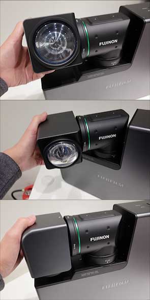 Ein letztes neues Produkt musste noch vorgestellt werden: Ein Beamer mit drehbarem Objektiv, der in sechs verschiedene Richtungen projizieren kann und damit noch aus 75 cm Entfernung ein 254 cm großes Bild erzeugt – auch im Hochkantformat, falls gewünscht. Fuji hat schon länger Projektionsobjektive gebaut, aber nur als OEM-Hersteller agiert; dieser Projektor ist das erste eigene, unter dem Fujifilm-Label vermarktete Produkt. Der Preis des Beamers steht noch nicht fest.
