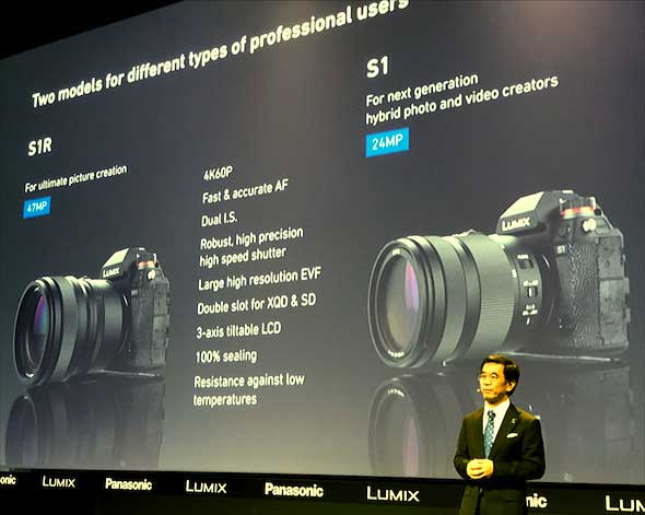 Die Panasonic-Pressekonferenz fand dann im Anschluss im selben Saal statt, und nachdem man die 10 Jahre, die Panasonic nun im spiegellosen Bereich aktiv ist – länger als jeder andere Hersteller –, rekapituliert hatte, ließ Panasonic die Katze aus dem Sack: Nächstes Jahr kommen zwei Kleinbildkameras mit L-Mount. Das ist einmal die S1R mit 47 Megapixeln, einem integrierten Bildstabilisator, einem besonders robusten Verschluss, zwei Kartensteckplätzen für XQD und SD (so geht das, Nikon!) und einem dreh- und schwenkbaren Hauptdisplay und einem monochromen Statusdisplay auf der Oberseite. Die S1 mit 24 Megapixeln ist dagegen als hybride Kamera für Fotos und Video konzipiert. Zu diesen Kameras passt Panasonics Lumix-Pro-Service für professionelle Fotografen, der weltweit angeboten werden soll.