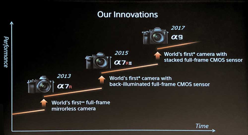 Tatsächlich war es dann aber eine Tour d’Horizon zu Sonys E-Mount-Kamerasystem. Den unausgesprochenen Hintergrund bildete Canons und Nikons Ankündigungen eigener spiegelloser Kleinbildsysteme, und wohl auch die Ankündigung der L-Mount-Allianz zwischen Leica, Panasonic und Sigma. Tanaka betonte Sonys fünfjährige Erfahrung in diesem Segment, die technischen Innovationen, die sie in dieser Zeit verwirklicht haben, und das breite Sortiment an Kameragehäusen und Objektiven. Tanaka ging auch darauf ein, wie viele Komponenten Sony in-house produziert, und dass sie Marktführer sowohl bei den Bildsensoren wie auch den elektronischen Suchern sind. Und um das von Canon und Nikon in den Pressekonferenzen später am Tag möglicherweise vorgebrachtes Argument gleich zu entkräften: Nein, das Bajonett müsse keineswegs größer sein, um hoch korrigierte Objektivrechnungen zu ermöglichen, wie Tanaka mit Beispielen aus dem Tele- sowie dem Weitwinkelbereich illustrierte.