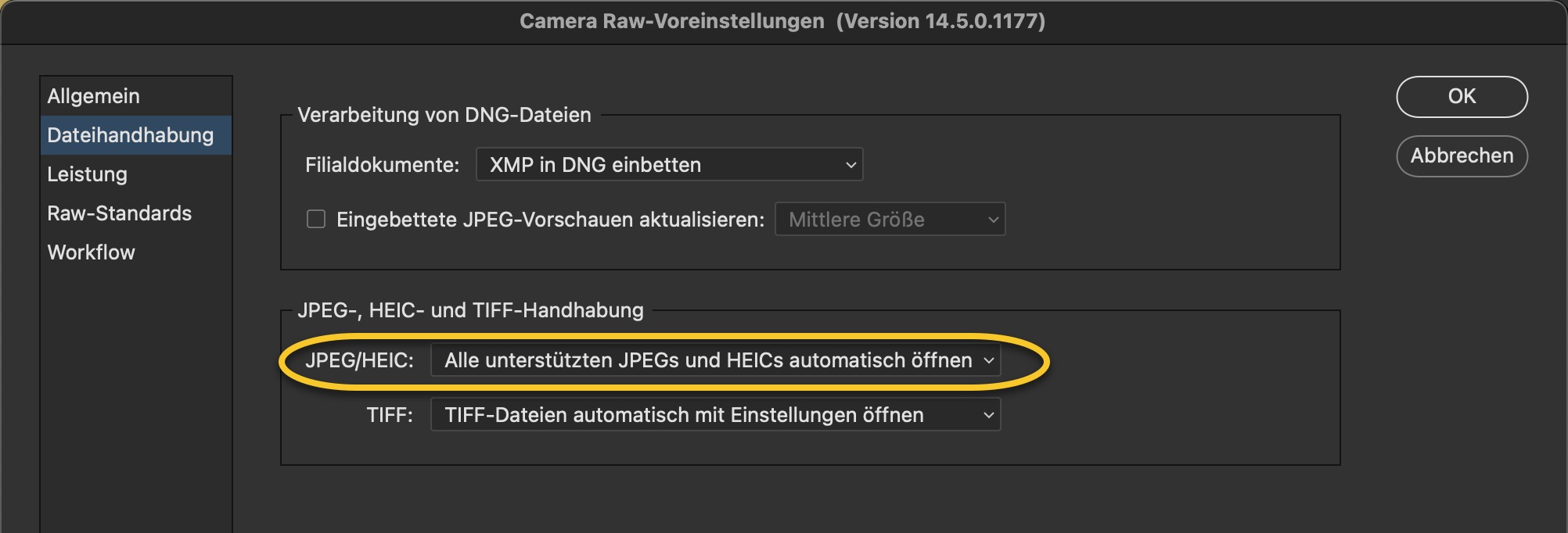 Die Voreinstellungen finden Sie unter allen Betriebssystem mit einem Klick auf das Zahnrädchen, oben rechts im Camera Raw-Dialog. Wählen Sie unter »Dateihandhabung« für JPEG/HEIC die Option »Alle unterstützten JPEGs und HEICs automatisch öffnen«. Diese Dateien werden nun wie Raw-Dateien immer zuerst in Camera Raw und nicht direkt in Photoshop geöffnet. Sie benötigen also keine Tricks mehr im Öffnen-Dialog oder in Adobe Bridge zu kennen.
