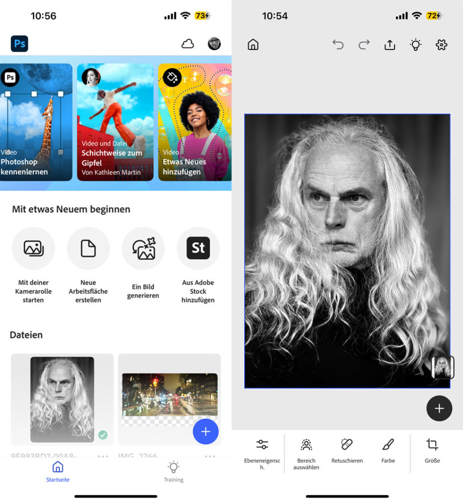 Photoshop auf einem tragbaren Gerät – im Grund ist das nicht ganz neu. Schon 2008 stellte Adobe Photoshop Express vor, 2009 folgte Photoshop.com Mobile, 2012 Photoshop Touch und 2015 Adobe Photoshop Fix. 2024 vereinten sie Adobe Photoshop Express und Adobe Photoshop Fix unter dem Namen Adobe Photoshop Express. Diese Versionen bitte nicht mit Adobe Photoshop Elements verwechseln, das es seit 2001 für PCs und Macs gibt, zusätzlich zu den verschiedenen Versionen von Adobe Photoshop, Adobe Photoshop Lightroom und Adobe Photoshop Lightroom Classic. Kein Wunder, dass viele Nutzer nur von „Adobe“ sprechen, wenn sie ihre Bildbearbeitungssoftware meinen. Und nun einfach nur „Adobe Photoshop“ – auch auf dem Handy.