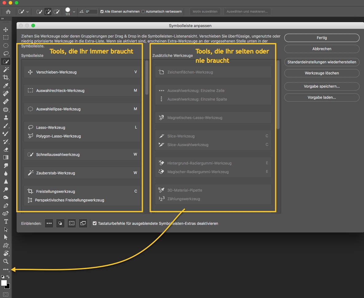 Also: Mistet Eure Werkzeugleiste mal aus und blendet nur die Tools ein, die Ihr wirklich ständig nutzt! 😉