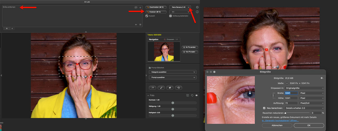 Wer regelmäßig mit hochauflösenden Fotos arbeitet, kennt das Problem: Ein KI-gestützter Eingriff soll nur einen begrenzten Bereich verändern, etwa das Gesicht einer Person (wie hier im Beispiel die Brille entfernen), eine Textur, ein Detail im Hintergrund, ohne den Rest des Bildes anzutasten. Genau hier setzt die neue Selektionen-Funktion an. Sie ermöglicht, einen bis zu 4098 Pixel großen innerhalb gezielt zu bearbeiten, ohne Qualitätsverlust und ohne sichtbare Übergänge – vorausgesetzt, man arbeitet mit dem Modell Banana Pro, das für nahtlose Kantenverläufe ausgelegt ist.