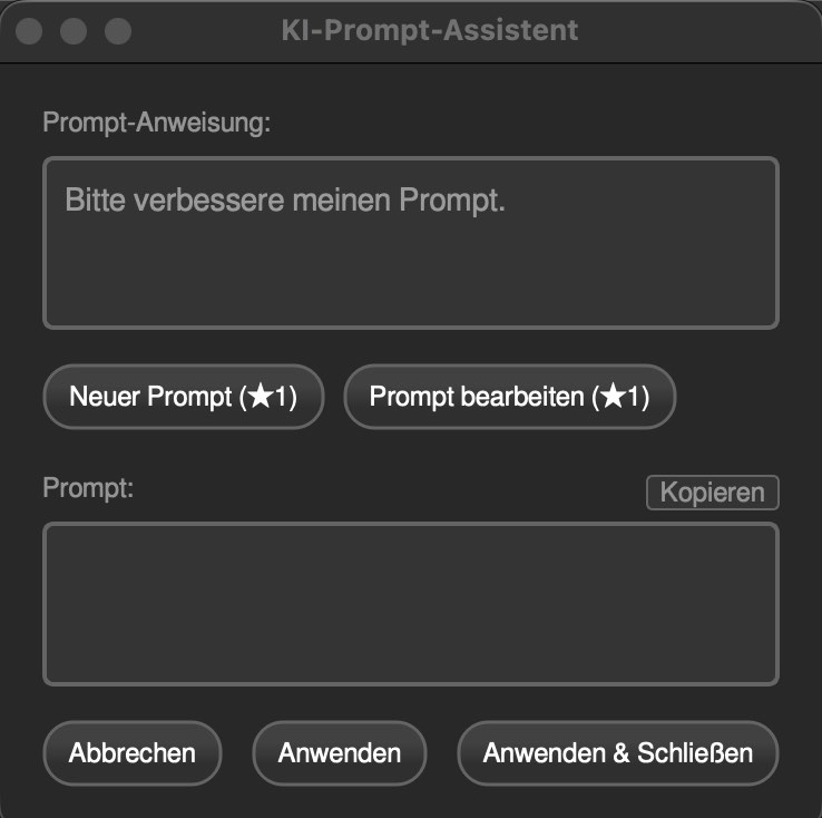 AI Lab 1.1.0 ist ein konsequent auf professionelle Anforderungen ausgerichtetes Update. Selektionen, Tabs und Prompt-Assistent schließen Lücken, die im täglichen Einsatz spürbar waren – und tun das mit einem Ansatz, der Kontrolle, Qualität und Effizienz in den Vordergrund stellt.