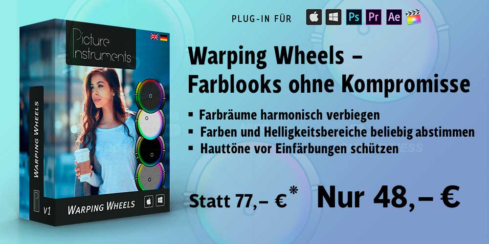 Der Name „Warping Wheels“ weist auf die von Picture Instruments erfundene Color-Warp-Technologie hin. Damit lassen sich Farben sehr harmonisch im Farbraum verbiegen. Das reduziert Kompressionsartefakte wie die Blockbildung oder Banding-Effekte.