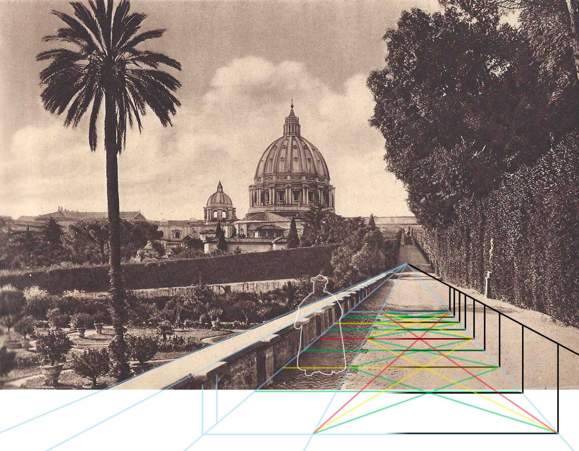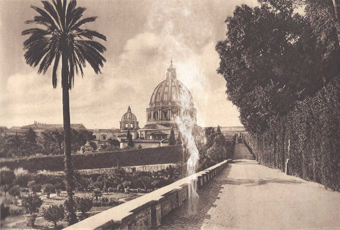 Eine wirkliche Hilfe bei der Analyse unserer beiden Ausgangsfotos sind all diese Varianten aber leider nicht. Sie belegen lediglich, dass diese Stelle in den Vatikanischen Gärten eine sehr beliebte Location gewesen sein muss. (Der Weg scheint heute nicht mehr zu existieren, jedenfalls konnte ich weder ihn noch die Palme auf Google Earth entdecken).