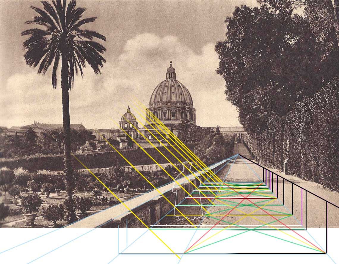 Und jetzt wird’s richtig verwirrend! Wir haben als weiteres Indiz ja noch die Schlagschatten der Mauer mit ihren vorspringenden Pilastern. An denen wurde wohl nichts verändert, da sie ja außerhalb der zu retuschierenden Papst-Konturen liegen. Wie ich schon beim letzten Mal gezeigt habe, steht die Sonne links und die Palme (wie die Sträucher links im Garten) wirft daher einen waagerechten Schatten. Verbinden wir die hinteren Ecken der Pilaster an der Mauer mit den hinteren Ecken der Schlagschatten … dann befinden sie sich alle (bis auf den vorletzten hinten, dem kein Schatten entspricht) an der ungefähr richtigen Stelle (die vorderen beiden liegen außerhalb des Bildes.)