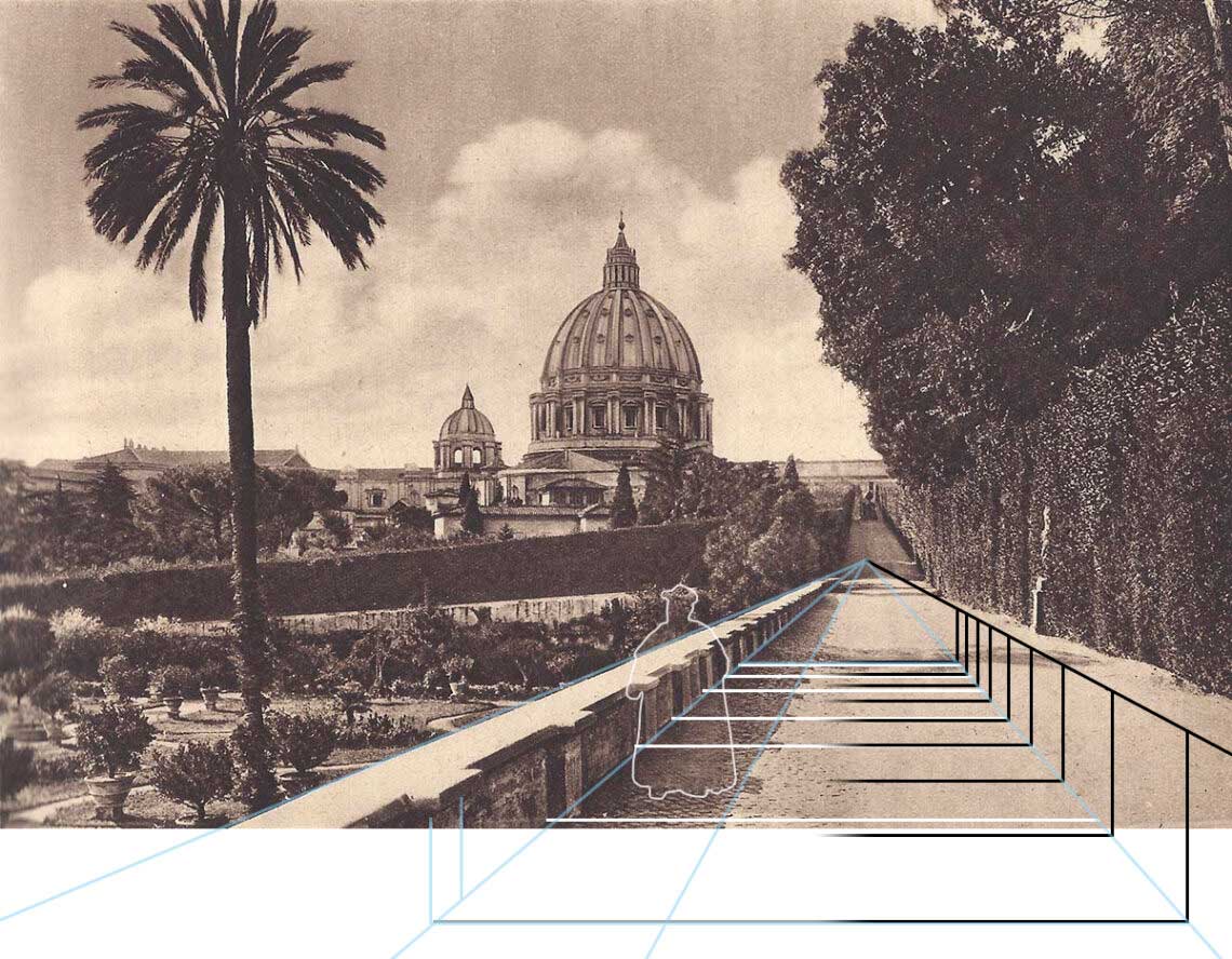 Hier ist noch ein Vergleichsbild vom Giardino Quadrato aus: https://pastvu.com/p/237171 (1930). Und hier ist eine weitere Version von 9 mit Pius X., die links, rechts und unten einen größeren Bildausschnitt (analog zu 8) zeigt: https://pastvu.com/p/237095 (1908). Was ich dagegen nicht gefunden habe, ist ein halbwegs aktuelles Foto, das von einer Position auf dem Viale del Giardino Quadrato aufgenommen wäre; möglicherweise kommt man auf den Führungen durch die Gärten nicht dorthin. (Falls dieser Aussichtspunkt der Öffentlichkeit tatsächlich nicht zugänglich sein sollte: Was hat der Vatikan dort zu verbergen? 😉 )