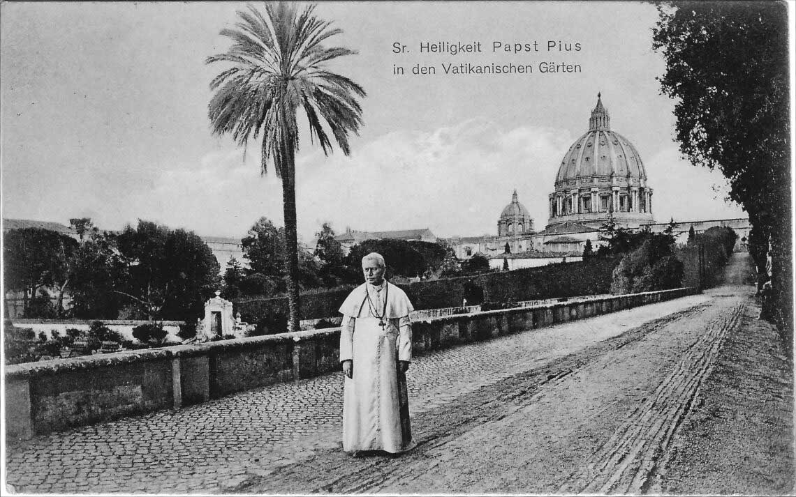 Nach dem Hinweis begann ich in dieser Richtung zu recherchieren und fand in der Tat etliche Bilder von Pius X. in den Vatikanischen Gärten. Und da ich weder Kosten noch Mühe scheue, um Ihnen interessantes Material anbieten zu können, habe ich etliche Ansichtskarten-Originale davon bestellt, selbst aus Barcelona. (Ich kann hier aus Urhebberrechtsgründen ja nicht einfach Bildmaterial aus dem Web wiedergeben.)