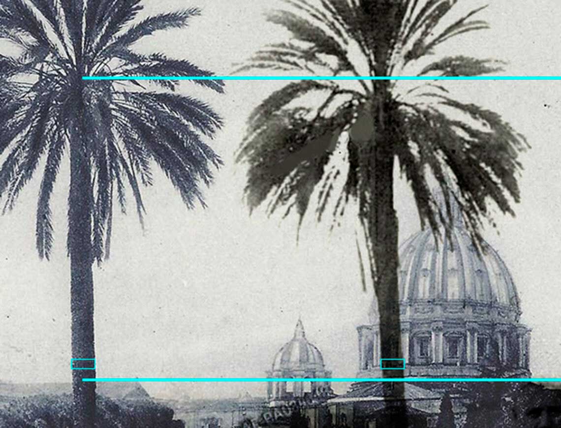 Ach ja, die Palme. Da könnte man auch noch etwas spekulieren. Ich habe mal versucht, die Palme aus einem unzweifelhaft echten Foto von Pius X. (rechts) auf denselben Stammdurchmesser zu bringen wie die in unserem Ausgangsbild (1). Genau gelungen ist mir das nicht (obwohl beide an derselben Stelle nun exakt dieselbe Breite in Pixeln haben) – die Krone in Bild 1 ist etwas höher. Das könnte (aber bitte ganz großer Konjunktiv) bedeuten, dass Bild 1 einige Jahre später aufgenommen wurde als das Vergleichsbild und der Baum inzwischen ein Stück gewachsen ist. Allerdings ist die Anordnung der Palmwedel in dem wahrscheinlich ebenfalls echten Fotos Nr. 8 und 9 der in Bild 1 seht ähnlich, was gegen die Hypothese der späteren Aufnahme spricht.