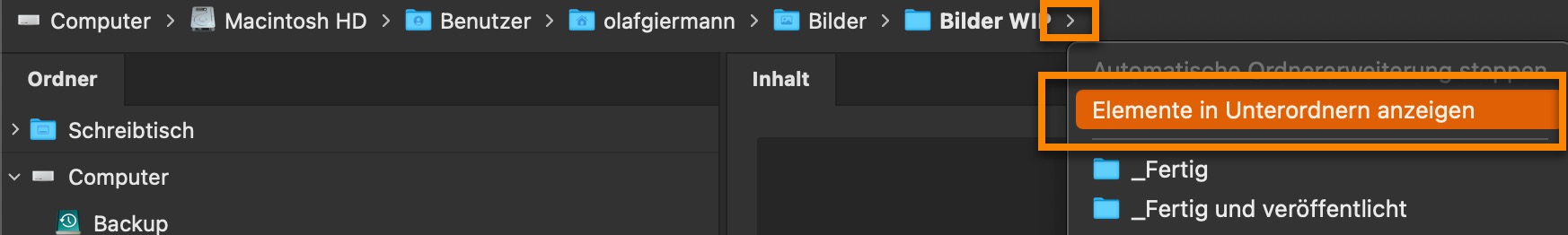 In Bridge lassen sich dazu alle Unterordner eines Ordners und die in ihnen wiederum enthaltenen Ordner und Dateien mit dem Menübefehl »Ansicht > Elemente in Unterordnern anzeigen« oder denselben Befehl über den kleinen Pfeil am Ende der »Pfad-Leiste« einblenden. Über das »×«-Symbol beenden Sie den Modus bei Bedarf wieder. Deaktivieren Sie »Ansicht > Ordner anzeigen«, falls Sie die Unterordner (wie in Lightroom Classic) nicht in der Übersicht angezeigt bekommen möchten.