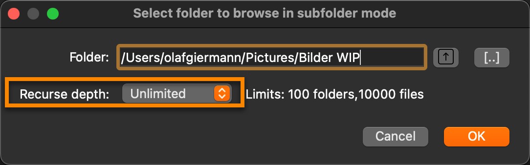 Hier kann man auch einstellen, wie tief dabei in die Ordnerhierarchie geschaut werden darf: