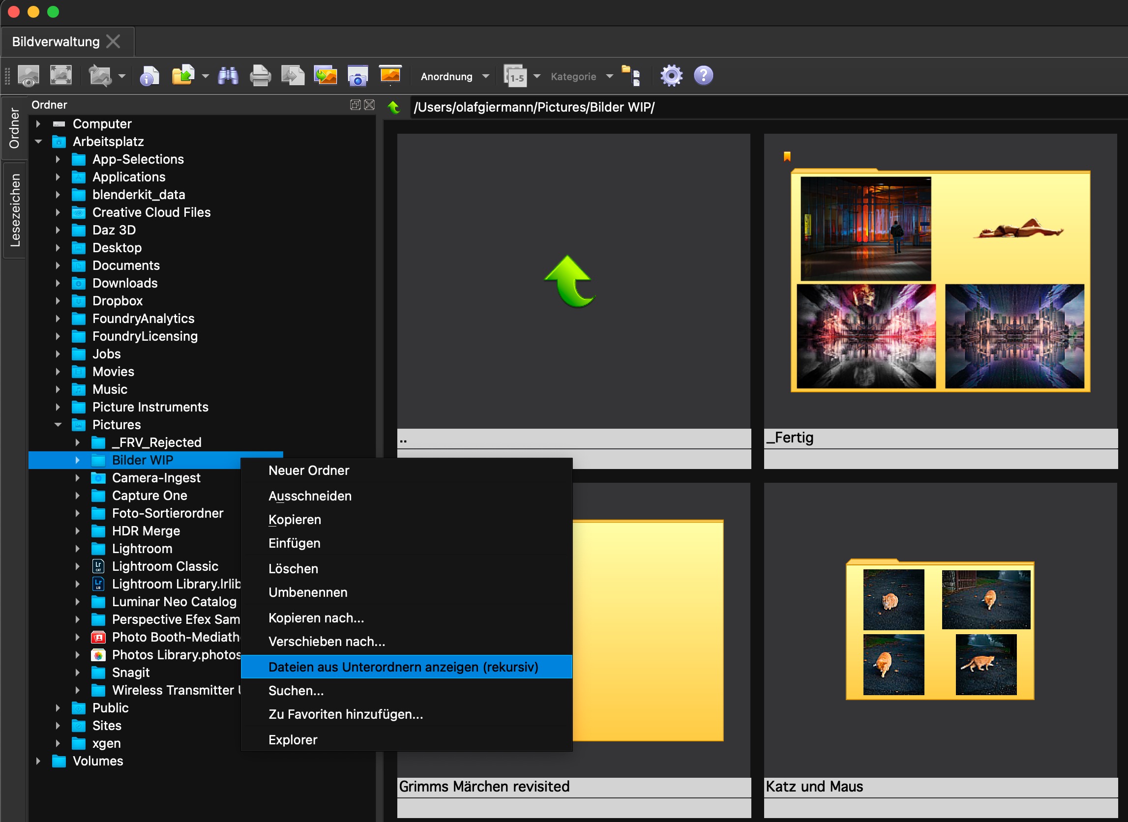 Dennoch fühlte ich mich nach dem Installieren der Testversion sofort wieder heimisch. Es gibt die gleiche Ordnerinhaltsvorschau wie in XnViewMP, nur dass die UI deutlich polierter ist (bei einer Kaufsoftware kann man das auch erwarten!) und ich jede gesuchte Option intuitiv schnell finde. Was mir fehlte: die rekursive Bildanzeige!