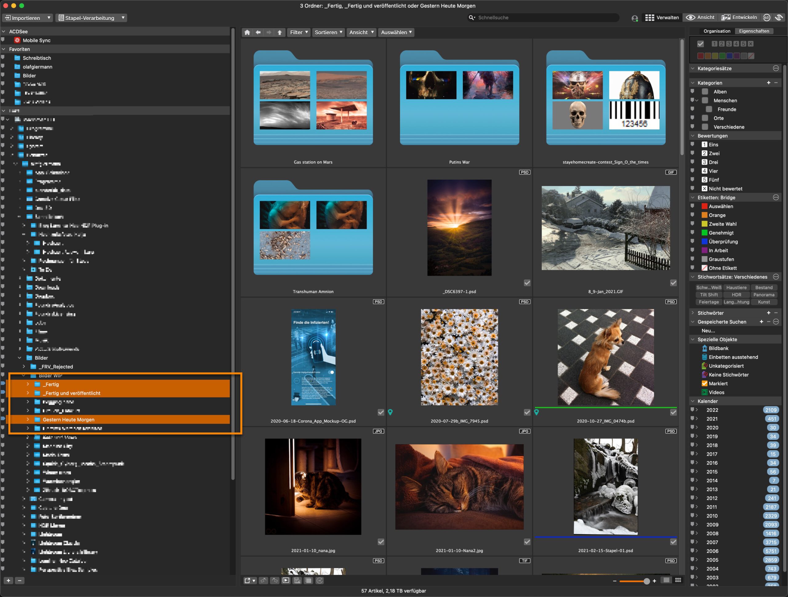 Für meine Zwecke ist dadurch ACDSee zur Schaltzentrale für das Management meiner privaten und beruflichen (DOCMA) Projekte geworden. Jedenfalls, bis Adobe es schafft, die Bridge für Apple Silicon zu aktualisieren, die Geschwindigkeit mit ACDSee mithalten kann und vielleicht auch die praktischen Ordnersymbol-Bildvorschauen einführt. Aber dann würde ich wahrscheinlich immer noch die Mehrfachauswahl der Ordner vermissen.