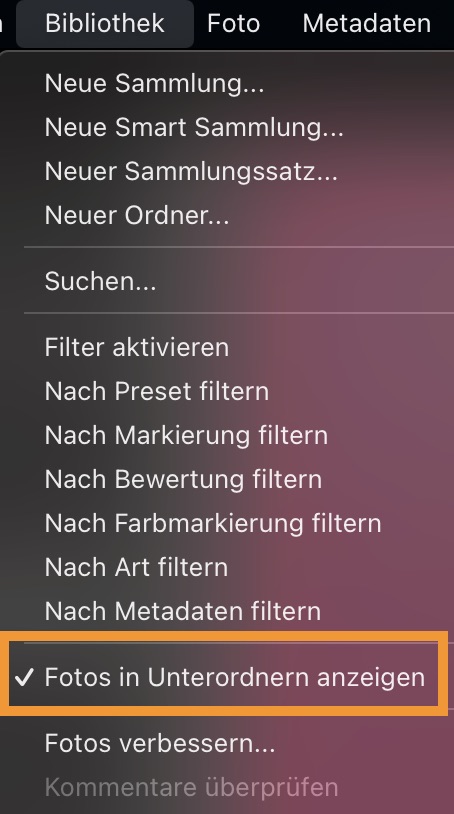 Perfekt umgesetzt ist die rekursive Bildanzeige in Lightroom Classic – denn dort ist sie Standard: Sie sehen immer alle Bilder eines Ordners und alle Bilder in enthaltenen Unterordnern, wenn Sie einen Ordner anklicken. Möchten Sie ausschließlich die Bilder sehen, die im ausgewählten Ordner liegen, deaktivieren Sie im Menü »Bibliothek« die Option »Fotos in Unterordnern anzeigen«: