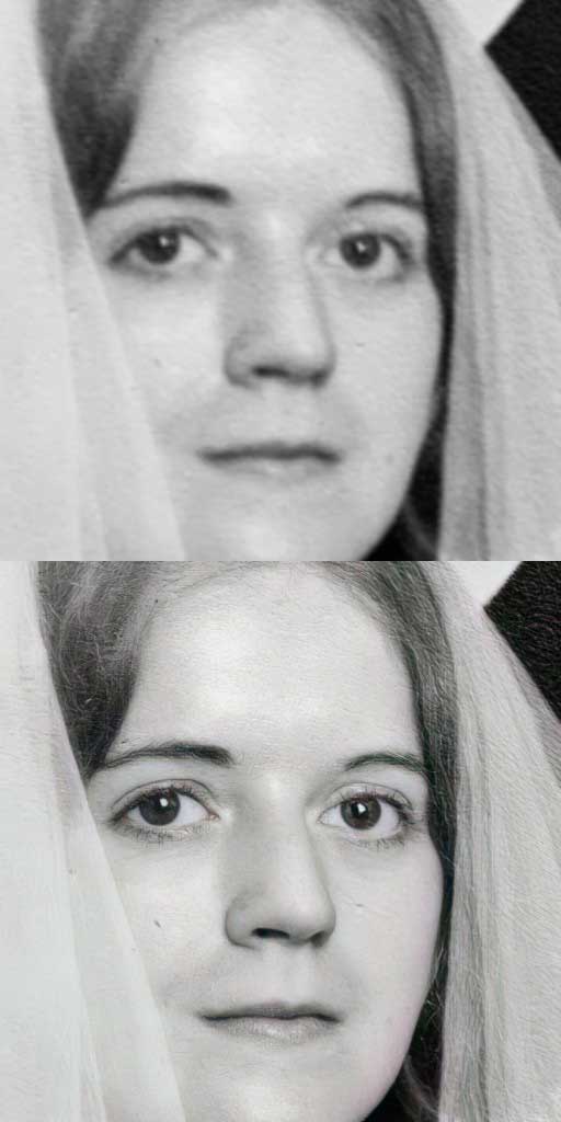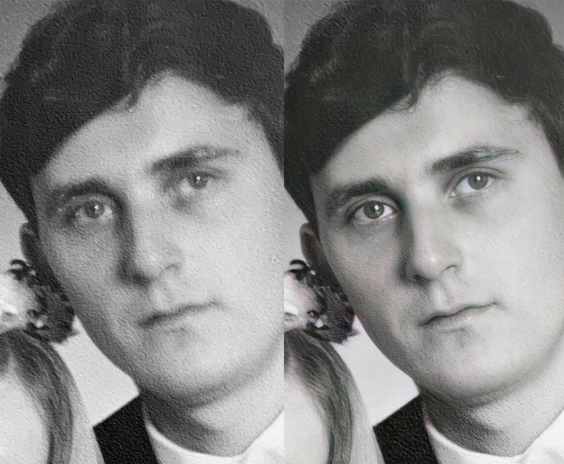 Was soll ich sagen: Das Ergebnis dieses Prozesses ist – nicht immer, aber in der Regel – erstaunlich. Erstaunlich scharf und vor allem auch erstaunlich nah am Original! Ein Beispiel: das Hochzeitsfoto meiner Eltern. Die Porträts mal vergrößert gezeigt.