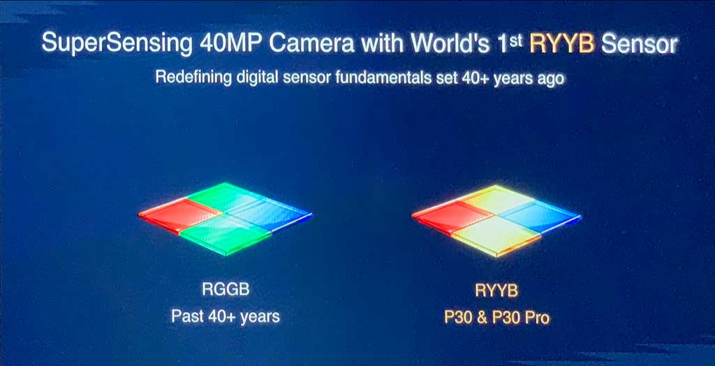 Die Grundfarben Rot, Gelb und Blau sind ebenso wie Rot, Grün und Blau geeignet, alle wahrnehmbaren Farben durch additive Mischung darzustellen, aber da die Gelbfilter einen größeren Spektralbereich passieren lassen, der von Rot über Gelb bis Grün reicht, sind die gelbempfindlichen Sensorpixel laut Huawei rund 40 Prozent empfindlicher, was ziemlich genau einer halben Blendenstufe entspricht. Auch beim klassischen Bayer-Filtermuster ist die Empfindlichkeit der Sensorpixel nicht einheitlich; die grünen Pixel haben durchweg die höchste Empfindlichkeit, gegenüber der die Empfindlichkeit für Rot und insbesondere Blau abfällt. Da eine Überbelichtung eines Farbkanals vermieden werden muss, entspricht die Empfindlichkeit des Sensors der ihrer empfindlichsten Pixel, also in diesem Fall der gelbempfindlichen Pixel. Der neue Sensor ist daher um eine halbe Blendenstufe empfindlicher. Das scheint ein offensichtlicher Vorteil zu sein, aber ganz so einfach ist es nicht.