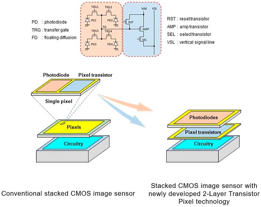 Ein Sensorpixel enthält eine lichtempfindliche Fotodiode, in der auftreffende Photonen Elektronen freisetzen, und dazu mehrere Transistoren, die unter anderem zur Verstärkung der geringen Spannungen nötig sind. Beim klassischen Sensordesign müssen sich die Fotodiode und die Transistoren die Fläche des Pixels teilen, so dass nicht das ganze Pixel lichtempfindlich ist. Legt man die Pixel nun aber zweistöckig an und verbannt die Transistoren in das lichtlose Souterrain, profitieren beide Seiten: Die Fotodioden können sich oben über die gesamte Pixelfläche erstrecken und werden damit empfindlicher; sie empfangen mehr Licht und erzeugen entsprechend höhere Spannungen. Die Transistoren bekommen unten ebenfalls mehr Platz, und größere Transistoren erzeugen bei der Signalverstärkung weniger Rauschen. Beide Faktoren zusammen führen zu einem höheren Rauschabstand und einem vergrößerten Dynamikumfang. Obwohl sich Sony nicht weiter dazu auslässt, scheint ihr Konzept noch eine dritte Halbleiterschicht mit weiteren Schaltkreisen vorzusehen; hier ließen sich die A/D-Wandler und nötigenfalls schnelle Pufferspeicher unterbringen.