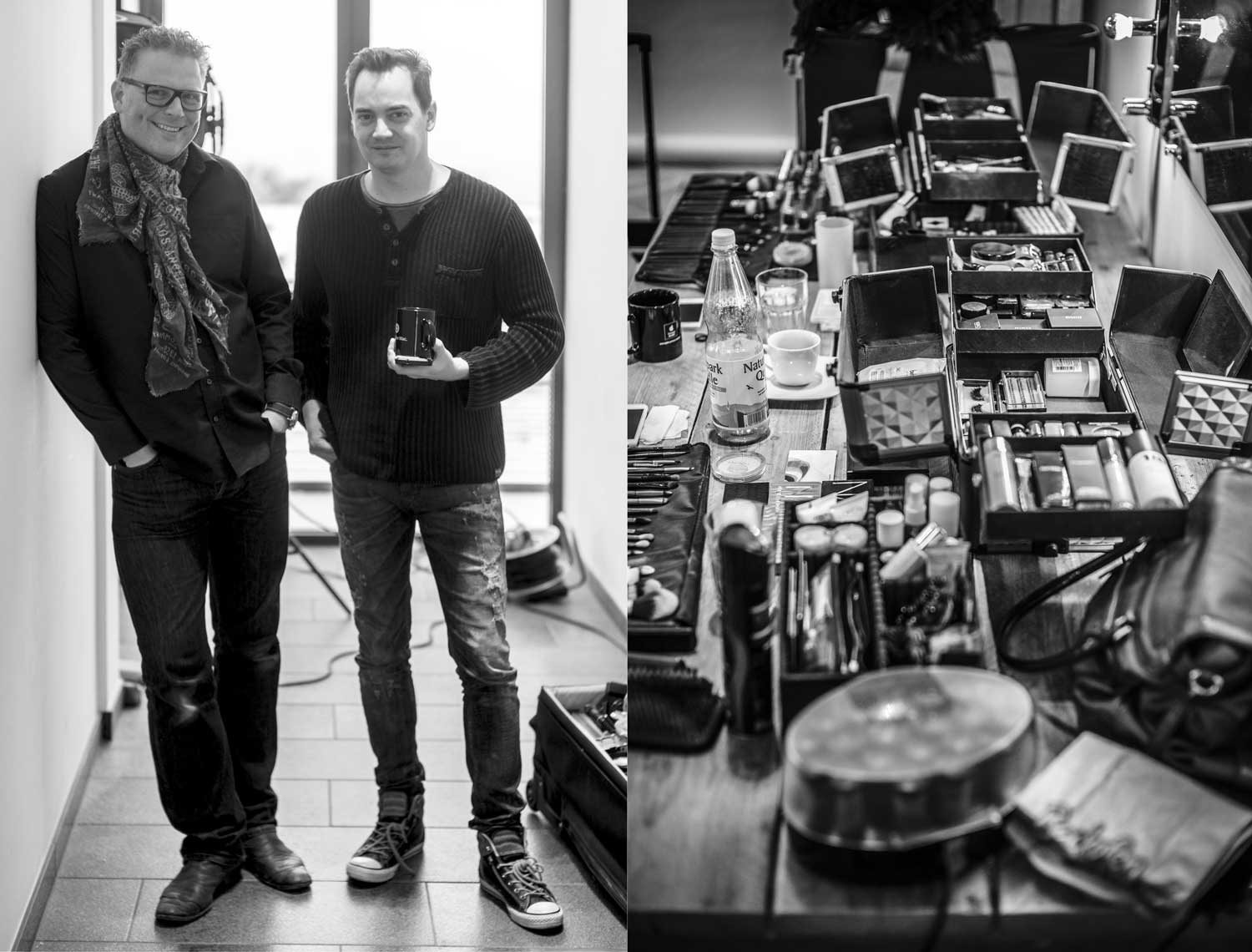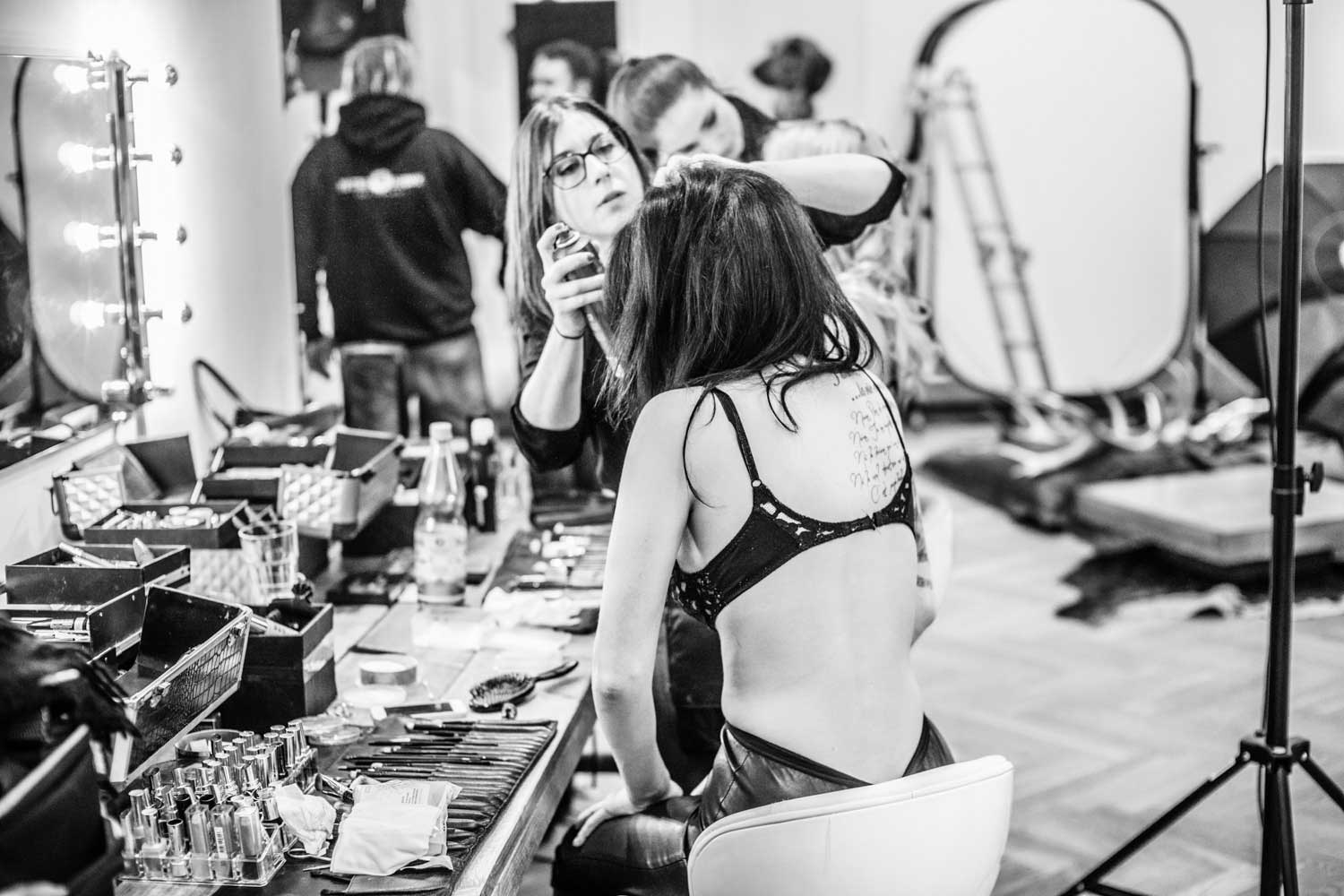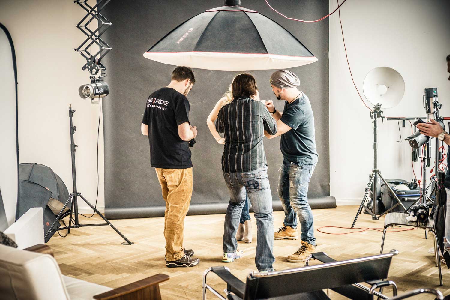 Kurz vor dem Start: Die Organisatoren Alexander Heinrichs (li.), Sven Doelle (re.) und viel Beauty-EquipmentDas große Vorbereiten: Kerstin Hoppe schminkt Playmate Noelle MondoloniElvira Igrineva schminkt Playmate Sarah DomkePlaymate Sarah Domke post sich warm.Fotograf Sacha Hüttenhein instruiert ein Teilnehmer-TeamMartin Krolop erklärt am praktischen Beispiel.DomQuichotte beim Kaffee-FassenMadelaine Handle – am ersten Tag als Making-of-Fotografin unterwegs…… und am zweiten Tag dann selbst als Model im Ring.Hier sieht man das ganze Set zum Model-Bild von Madeleine, an dem Matthias Schwaighofer einen Team die Aufnahmetechnik erläutert.Danach war eine Zigarettenpause im Atrium des Ateliers angesagt.In dem kleinen Innenhof bleib man selten allein, denn Raucher sind gesellige Menschen.Fotograf Peter Hawk hatte in diesem Moment allerdings mehr für belegte Wurst- als für dampfende Lungenbrötchen übrig.Mittagspause mit Playmate Franzy BalfanzErregte Fachgespräche am Brötchenbuffet.Studioimpression: Es müssen nicht immer Playmates sein.Haarteil-Probe: Martin Krolops Begeisterung angesichts dieser neuen Frisur ist deutlich erkennbar.Farbiges Dauerlicht im Fahrstuhl…… mit Playmate Franzy BalfanzMisch-Lichtset bei Krplop und Gerst mit der horizontal arrangierten Playmate Sarah Domke.Blick über eine Fotografenschulter auf Playmate Barbora Kuzmiakova.Immer gut gelaunt und maximal gelenkig: Playmate Annetta NegarePlaymate noch einmal mit viel Text auf dem Rücken.Am Ende des ersten Workshoptages wurde noch ausgiebig über die entstandenen Drucke diskutiert. Rechts im Bild Murat Ermiel von Fotolia.Es geht nicht nur um gutes Licht und schöne Frauen, es kommt machnmal auch auf andere Inhalte an.