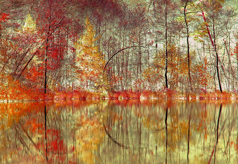 Über die Entstehung dieses Bildes schreibt Greta Schnall: „Es war an einem Herbsttag 2011 kurz nach dem Tod meiner Mutter. Zur Ablenkung von meiner Trauer hatte ich das dringende Bedürfnis zu fotografieren. An diesem Tag herrschte ein besonderes, diffuses Sonnenlicht. So ging ich an einen kleinen See in der Nähe, dessen Ufer bei diesem Licht wie verzaubert wirkte, und nahm diese Baumgruppe am Seeufer auf. Da ich aber genauso gern bildbearbeite wie fotografiere, wollte ich den Zauber durch die Bearbeitung noch verstärken. So entstand Herbst am See“.