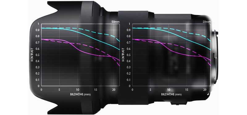 MTF-Kurven für das Sigma 50mm F1,4 DG HSM Art. Die Kurvenverläufe zeigen an, wie sich der Kontrast von der Bildmitte bis zu den Rändern ändert.
