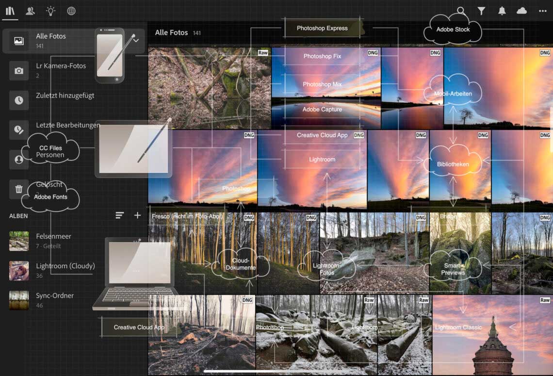 Wer ein Smartphone oder iPad hat und Adobes Foto-Abo benutzt, weiß es vielleicht schon zu schätzen, seine Fotos bequem auf dem Sofa sichten, bewerten und (vor-)entwickeln zu können. Bei Lightroom (Mobile/Cloud) werden die Original-Raws hochgeladen. Das führt angesichts der eher mageren 20-GB Standard-Cloudspeicher bei hochauflösenden Kameras dazu, dass dieser Speicher bald voll ist. Nerviger ist jedoch, dass der Upload der Original-Dateien je nach Internetverbindung erdrückend lange dauern kann. Hat man die Dateien am Desktop-Rechner hochgeladen, muss alles am iPad auch wieder heruntergeladen werden. Also, ich bin dafür zu ungeduldig.