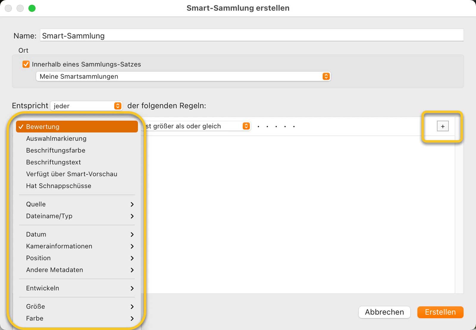 - eine Smart-Sammlung mit den gewünschten Such-Parametern anlegen,
