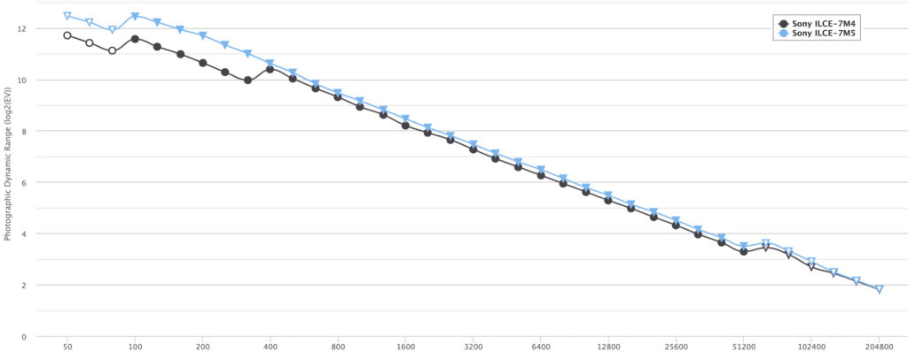 Schaut man sich die Kurven genauer an, so erkennt man, dass die Messpunkte der Alpha 7 V durch Dreiecke markiert sind – statt mit Kreisen wie bei der Alpha 7 IV. Das weist darauf hin, dass Photons to Photos eine bereits in die Rohdaten eingerechnete Rauschunterdrückung entdeckt hat, die also nicht rückgängig gemacht werden kann. Ein geringeres Rauschen führt naturgemäß zu einem größeren Dynamikumfang, wobei aber nagende Zweifel bleiben, die Rauschunterdrückung könnte die Bildqualität und insbesondere die Detailauflösung beeinträchtigen. Ob dieser Argwohn berechtigt ist, kann man derzeit noch nicht sagen, aber die gemessenen Verbesserung des Dynamikumfangs hat ohnehin nur wenig mit der Rauschunterdrückung zu tun – diese bringt lediglich einen Zugewinn von rund 1/6 EV. Wie aber ist der Sprung um 1 EV zu erklären, der zwischen ISO 100 und 320 gemessen wurde? Also in dem ISO-Bereich, in dem der Sensor der Alpha 7 IV im Low-Conversion-Gain-Modus betrieben wird, während die Alpha 7 V keine Umschaltung mehr vorzunehmen scheint?