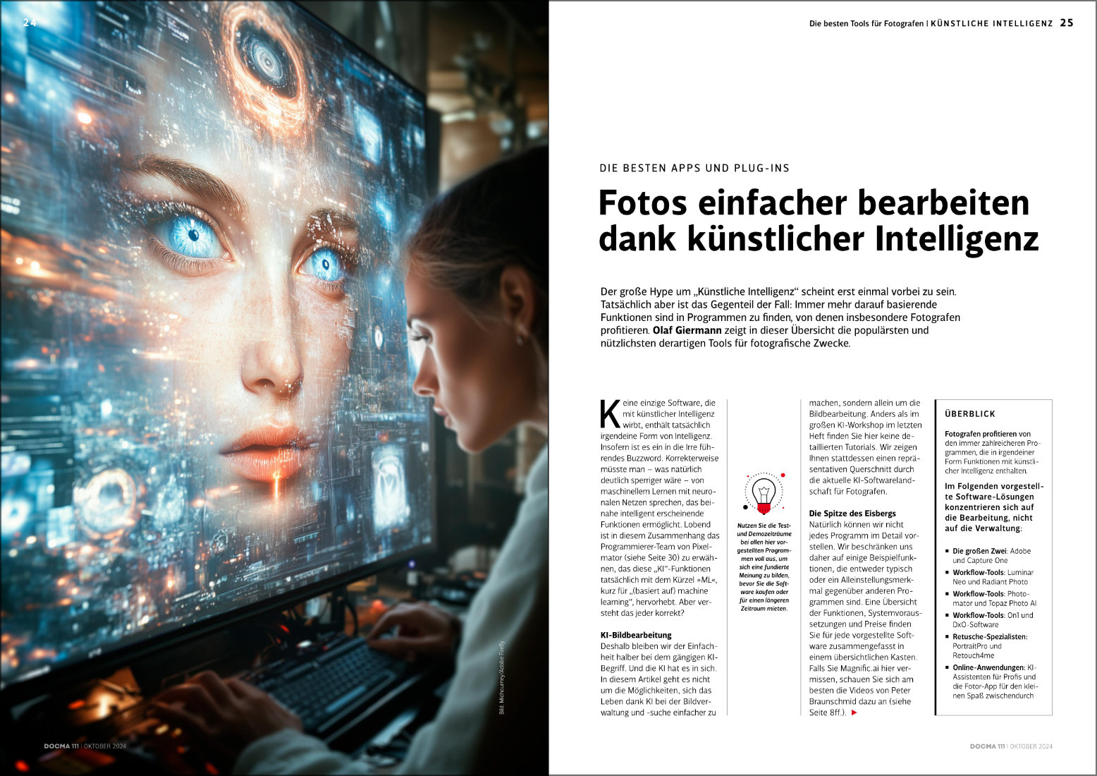 Jetzt ist aber die KI da und vieles sieht ganz anders aus. Dinge, die früher Stunden gedauert hätten, sind jetzt in einem Bruchteil der Zeit umsetzbar. Im aktuellen Heft DOCMA 111 stelle ich Ihnen einige Programme vor, die dabei zum Einsatz kommen können.