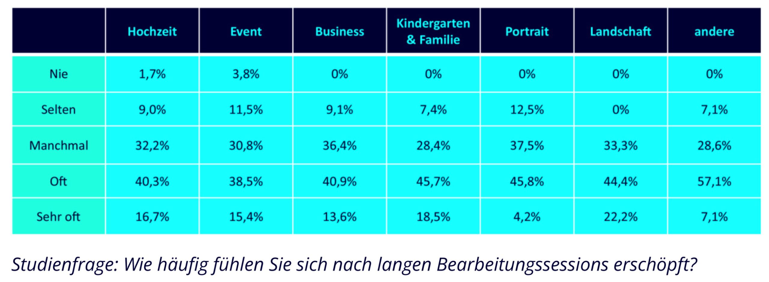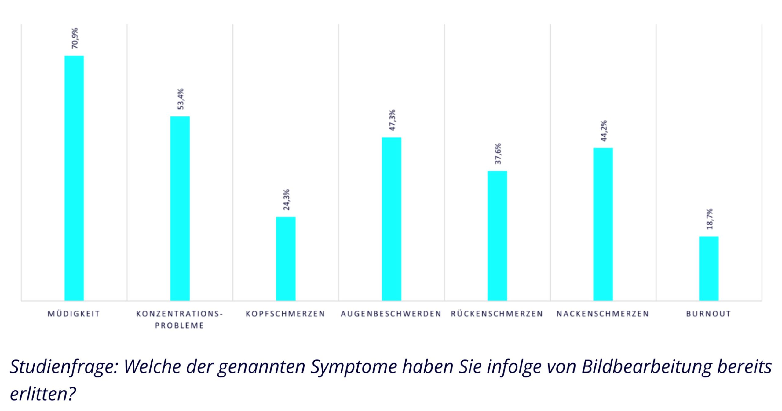 Das Fazit ist eindeutig: Umfangreiche Bildbearbeitung wirkt sich negativ auf die Gesundheit aus. 58,4 Prozent der Befragten gaben an, nach langen Bearbeitungssessions „häufig“ oder „sehr häufig“ an mentaler Erschöpfung zu leiden. Mehr als neun von zehn erklärten sogar, „grundsätzlich“ unter psychischem Druck zu stehen. Die häufigste Ursache hierfür ist Zeitdruck, wobei sich die Gründe je nach Altersgruppe und Branche unterscheiden.