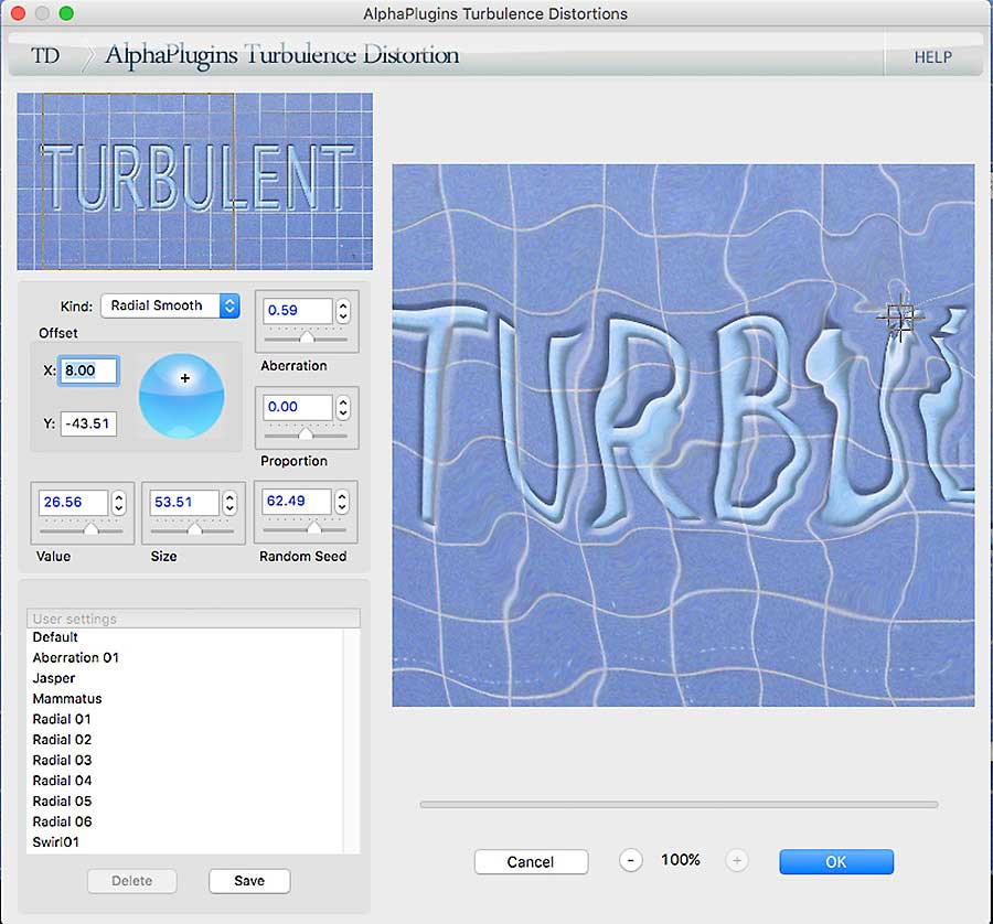 Sieht man von dieser Einschränkung ab, lassen sich mit „Turbulence Distorsion“ eindrucksvolle Resultate erzielen. Setzen Sie etwa die Verzerrungsstärke auf einen niedrigen Wert, können Sie Buchstaben leicht verzerren, ohne sie unlesbar zu machen.