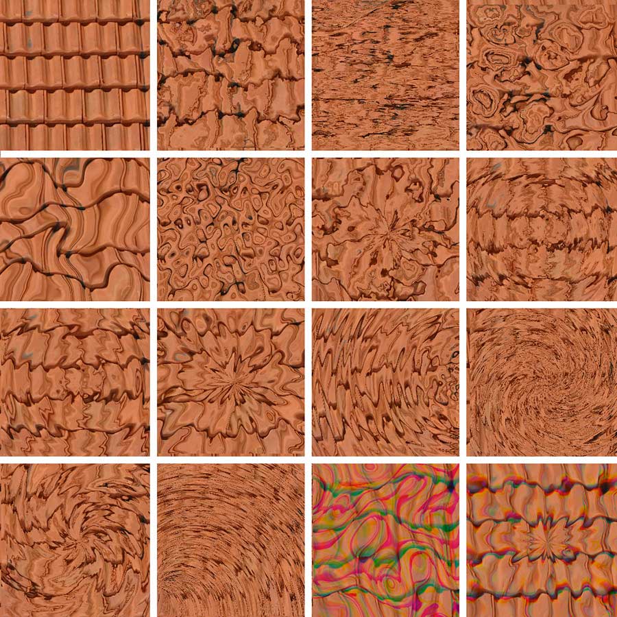 Abschließend möchte ich Ihnen etliche Beispiele zeigen, die alle aus dem kleinen Dachpfannen-Foto links oben entwickelt wurden. Sie sehen hier Anwendungen aller oben aufgeführten Verzerrungsarten von einfacher Turbulenz über radiale bis zur Verwirbelung, jeweils ungeglättet und geglättet und mit unterschiedlichen Stärken und Größen.