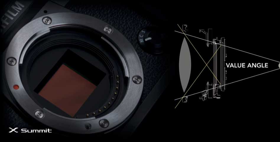 Fujis Konzept des Value Angle (wörtlich übersetzt also ein Wertwinkel) fasst nun die Kenngrößen Anschlussdurchmesser, Sensordiagonale und Auflagemaß zu einer handlichen Zahl zusammen. Die Idee ist, dass ein möglichst großer Winkel generell vorteilhaft ist und den Bau von Objektiven erlaubt, die eine besonders hohe Bildqualität liefern.