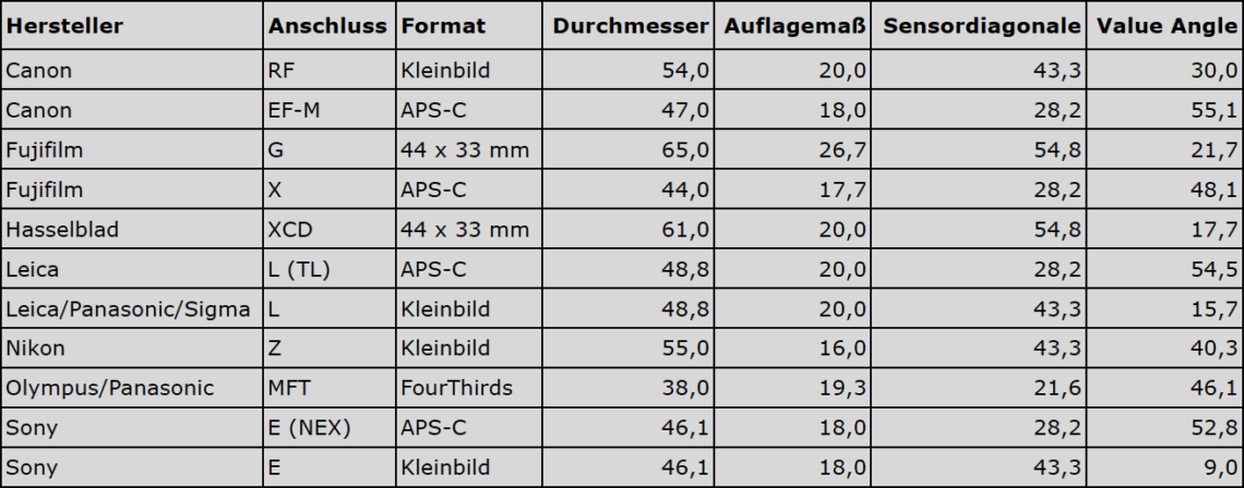 Nach dem „Value Angle“ wäre also Sony E Mount (Vollformat) das ungünstigste Bajonett.