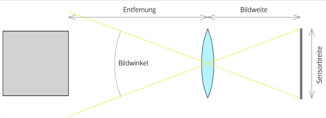Wie groß eine Linse abbildet, lässt sich leicht veranschaulichen. Dazu betrachtet man der Einfachheit halber die Lichtstrahlen, die durch die Mitte der Linse gehen, denn diese werden nicht gebrochen. Wie man anhand der Illustration erkennt, entspricht das Verhältnis der Bildgröße zur Motivgröße dem Verhältnis der Bildweite (dem Abstand zwischen Linse und Sensor, in dem ein scharfes Bild entsteht) und der Entfernung. Vergrößert man also bei gleicher Entfernung den Abstand zwischen Sensor und Linse, vergrößert sich der Abbildungsmaßstab.