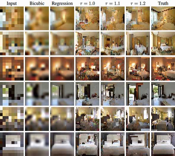 Das neue Super-Resolution-Verfahren arbeitet dagegen wissensbasiert: Wenn ein neuronales Netz beispielsweise durch das Training mit einer großen Zahl von Porträtbildern gelernt hat, wie menschliche Gesichter aussehen, kann es zu grob verpixelten Porträts passende Details hinzufügen. Konkret haben Dahl, Norouzi und Shlens das von ihnen entwickelte neuronale Netz einmal mit einer Sammlung von Porträts diverser Celebrities und in einem zweiten Test mit Fotos von Schlafzimmern trainiert. Die Besonderheit ihres Verfahrens ist, dass es einzelne Details nicht unabhängig, sondern aufeinander abgestimmt ergänzt, was die Qualität der Ergebnisse verbessert. Das Ziel der Wissenschaftler war nicht, die unverpixelten Originalbilder wiederherzustellen, sondern Bilder zu erhalten, die nicht von einem echten Foto zu unterscheiden sind. Diesem Ziel sind sie – zumindest unter günstigen Randbedingungen – recht nahe gekommen.