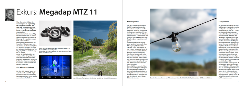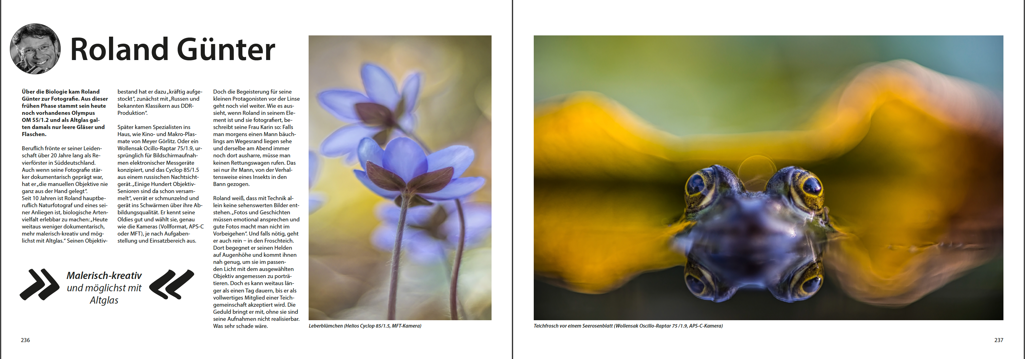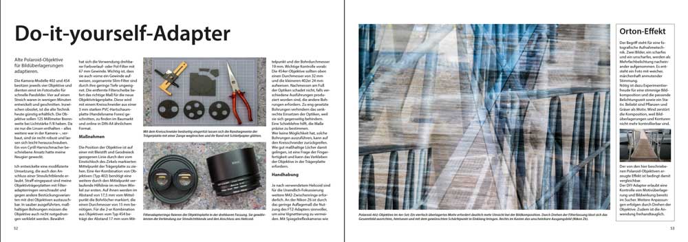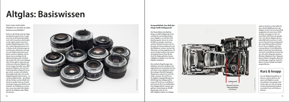 Im Buch zeigen sich diese Erkenntnisse dann in der Aufteilung auf vier Bereiche: Zunächst geht es um die technischen Aspekte: Grundwissen zu Objektiven, Digitalkameras und Adaptern. Danach setzt sich der Autor mit der Ästhetik auseinander, die die verschiedenen Objektivkonstruktionen nach sich ziehen. Ein Praxisteil zeigt wie man von alten Objektiven und ihren Eigenarten profitiert und was man im Workflow bis hin zur Raw-Entwicklung beachten muss. Zuletzt kommen in den „Case Studies“ zehn erfahrene Altglas-Experten zu Wort, die von der Arbeit mit ihren fotografischen Lieblingssujets berichten.