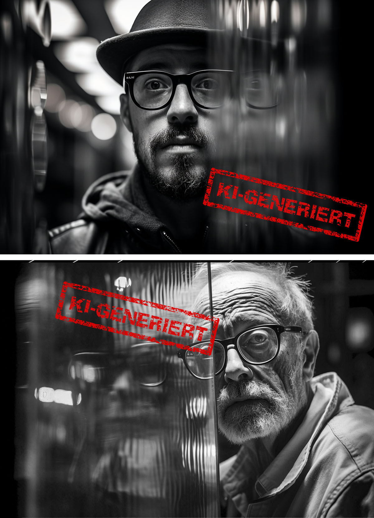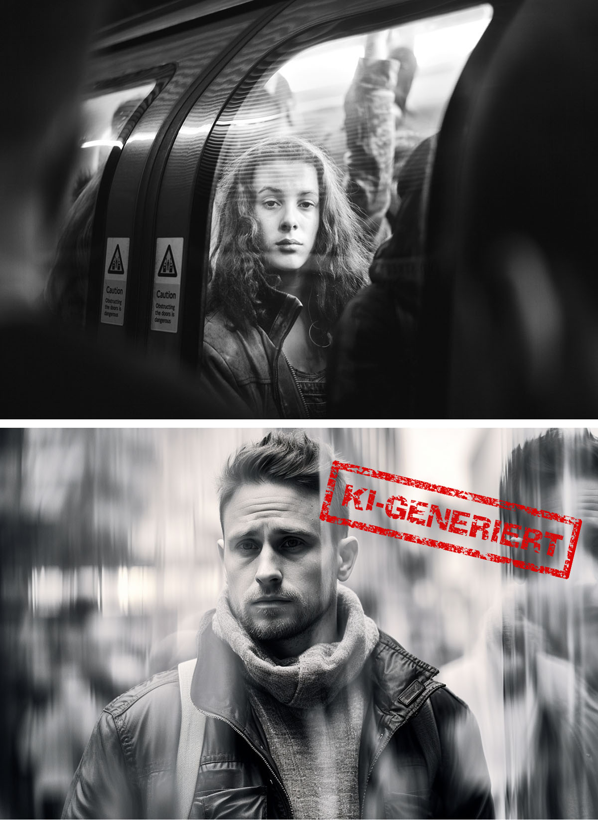 Ein bisschen fies war natürlich, dass die Bilder, in denen das Motiv durch irgendwelche unscharf abgebildeten Glasbausteine gebrochen noch einmal auftaucht, tatsächlich allesamt per KI generiert waren. Im Vorbild, der Frau in der U-Bahn, gibt es ja keine solchen Lichtbrechungseffekte, sondern lediglich Reflexionen im scharf abgebildeten U-Bahn-Fenster (und dass dieses Bild nicht KI-generiert war, konnte man am Text der Warnaufkleber erkennen). Ich ging davon aus, dass eines der Bilder mit Brechungseffekten echt sein müsste, und konnte mich für keines entscheiden. (Bei den Bildern mit dem hellen Lichtstreifen zwischen Schatten war die Entscheidung leicht, aber bei den übrigen mochte ich mich nicht festlegen.)