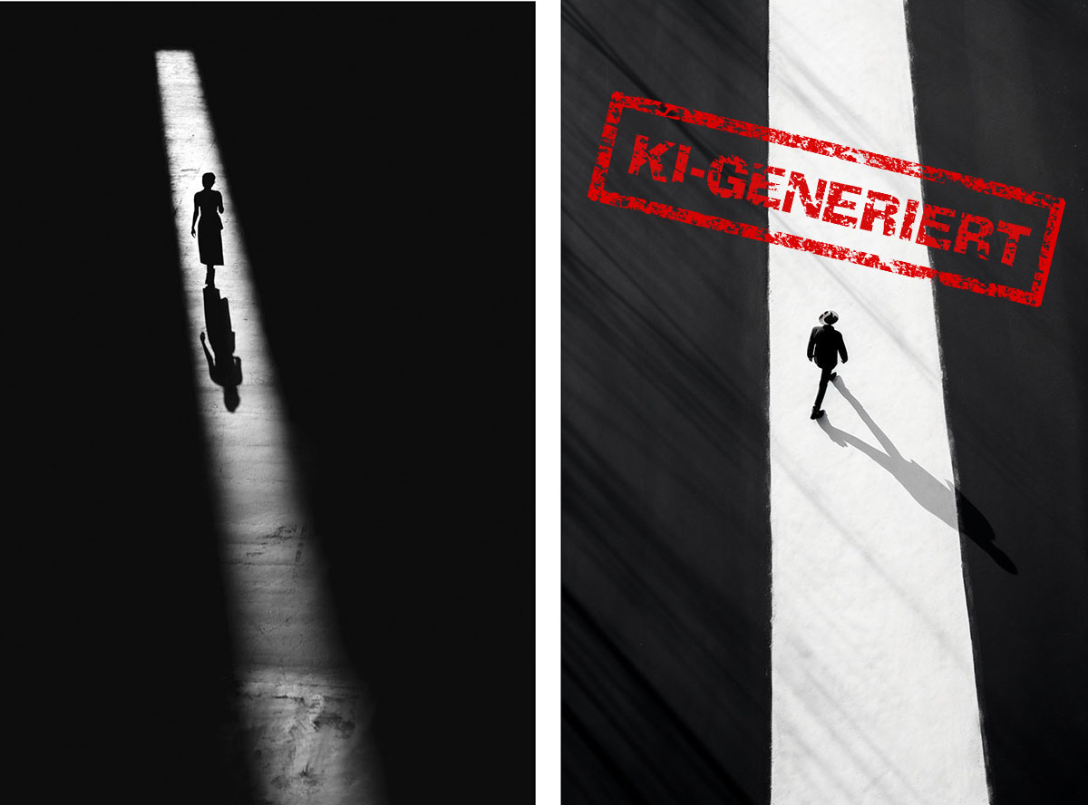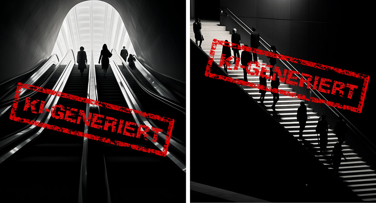 Ich selbst – ich gebe es unumwunden zu – wäre bei den meisten Beispielen nicht in der Lage gewesen, eine eindeutige Zuordnung vorzunehmen. Hinzu kommt noch eine kleine verborgene Erschwernis, die ich heimtückisch eingebaut hatte: Denn von den zehn Bildern, die ich Ihnen präsentiert hatte, war nicht, wie man hätte erwarten können, die eine Hälfte echt und die andere nicht, sondern sieben der Fotos kamen aus Midjourney und nur drei waren von Schaller. Hundert Punkte gibt es also nur, wenn alle zehn korrekt zugeordnet wurden. Haben Sie lediglich ein paar wenige richtig bewertet, ist das – leider – nach der Wahrscheinlichkeitsrechnung einfach zu erwarten, selbst wenn man blind tippt.