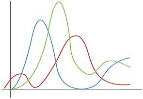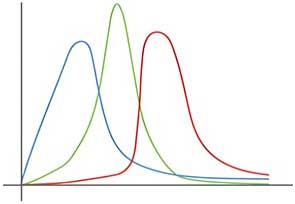 Wenn die Durchlasskurven von Phase Ones neuem Sensor wirklich so aussähen, wie in der Abbildung rechts dargestellt, wäre die Farbwiedergabe sehr schlecht. Da sich die Durchlassbereiche der Filter nicht überlappen, könnte der Sensor nur drei Farbtöne erkennen: Rot, Grün und Blau. Violett, Gelb, Orange oder Cyan gäbe es nicht, und auch Varianten der Farbsättigung wären nicht darstellbar. Lediglich Farben, die bereits durch eine Mischung verschiedenfarbiger Pigmente gebildet sind, könnten differenzierter erkannt werden, aber die reinen Spektralfarben eines Regenbogens beispielsweise würden in drei hart abgegrenzte Streifen von Rot, Grün und Blau zerlegt. Die Durchlasskurven von RGB-Filtern, die feine Differenzierungen von Farbton und Sättigung erlauben, müssten eher so aussehen wie in der Illustration links angedeutet, denn erst die Überlappung der Kurven macht das möglich. So funktionieren sowohl die farbempfindlichen Sinneszellen in der Netzhaut unserer Augen (deren Kurven sich noch viel stärker überlappen) als auch die Emulsionsschichten eines Farbfilms – und natürlich Sensoren mit RGB-Filtern im Bayer-Muster.