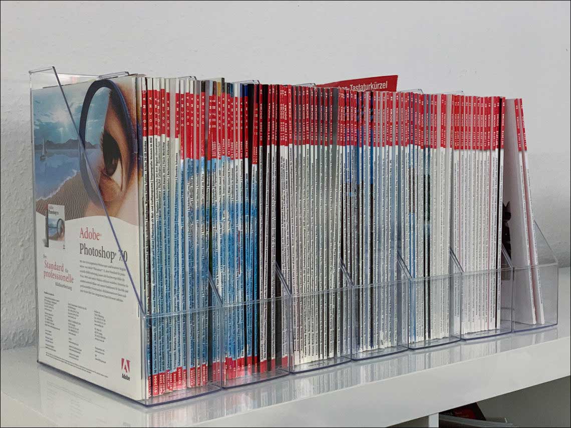 Warum ich Ihnen das alles schreibe? Nun, ab und an nehme ich noch einmal eine alte DOCMA zur Hand, um einfach mal zu schauen, ob ich nicht irgendetwas vergessen haben könnte, was Sie als Leser zu einem bestimmten Thema interessieren dürfte. Und da bin ich froh, mir ein Heft aus dem Regal zu ziehen und mich damit auf Sofa oder Balkon lümmeln zu können. eBooks, gut und schön, aber da fehlt die Haptik beim Halten und Umblättern und auch der Papiergeruch. Nun sind auf diese Weise meine DOCMA-Hefte nach und nach unsortiert und schief und krumm ins Regal zurückgewandert. Also war es an der Zeit, alles schön zu sortieren. Transpaerente Stehsammler (oder wie die Dinger heißen) gekauft und rein mit den DOCMAs. Und dabei kam eben die eine oder Erinnerung wieder hoch.